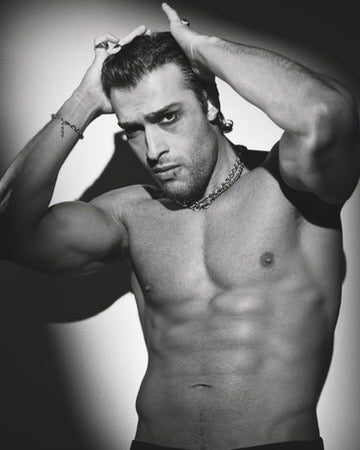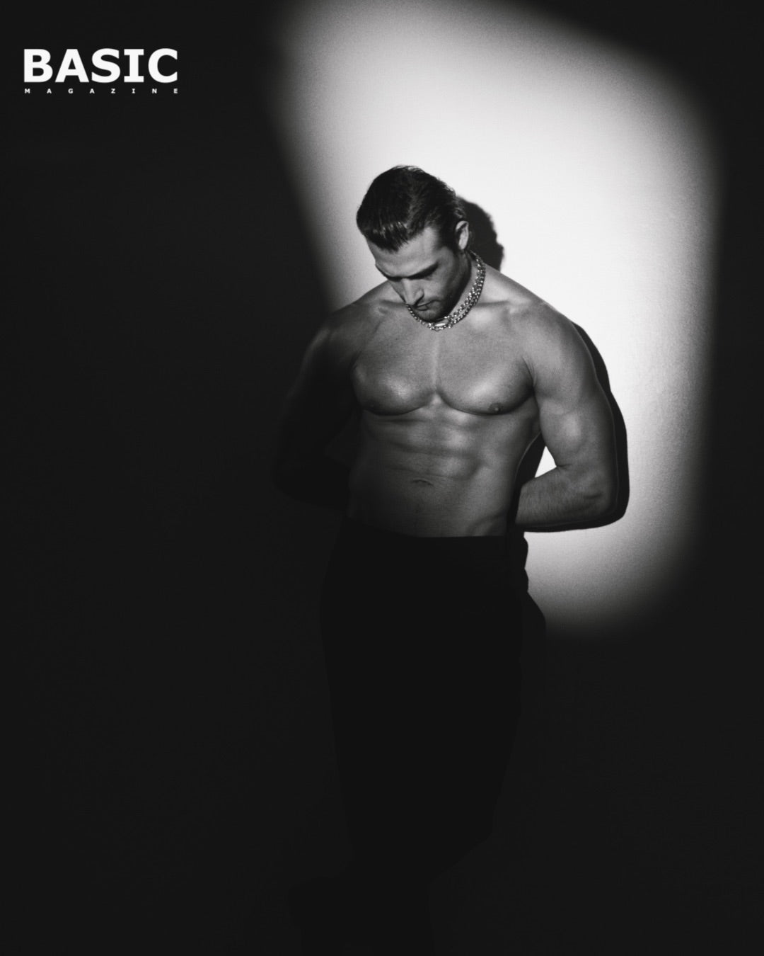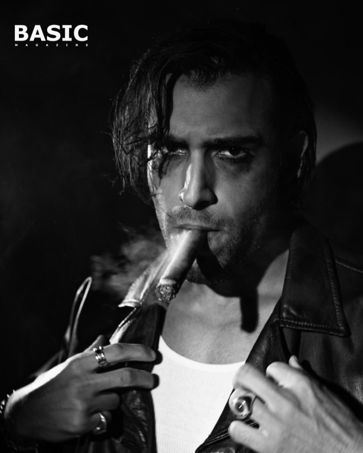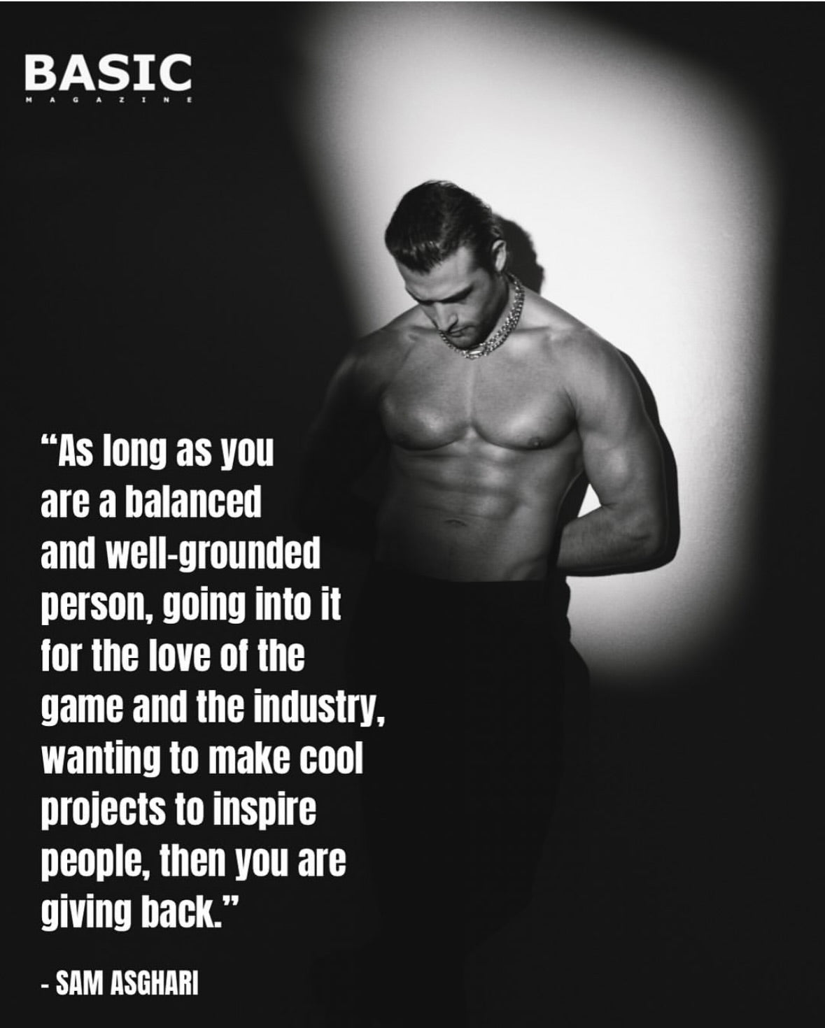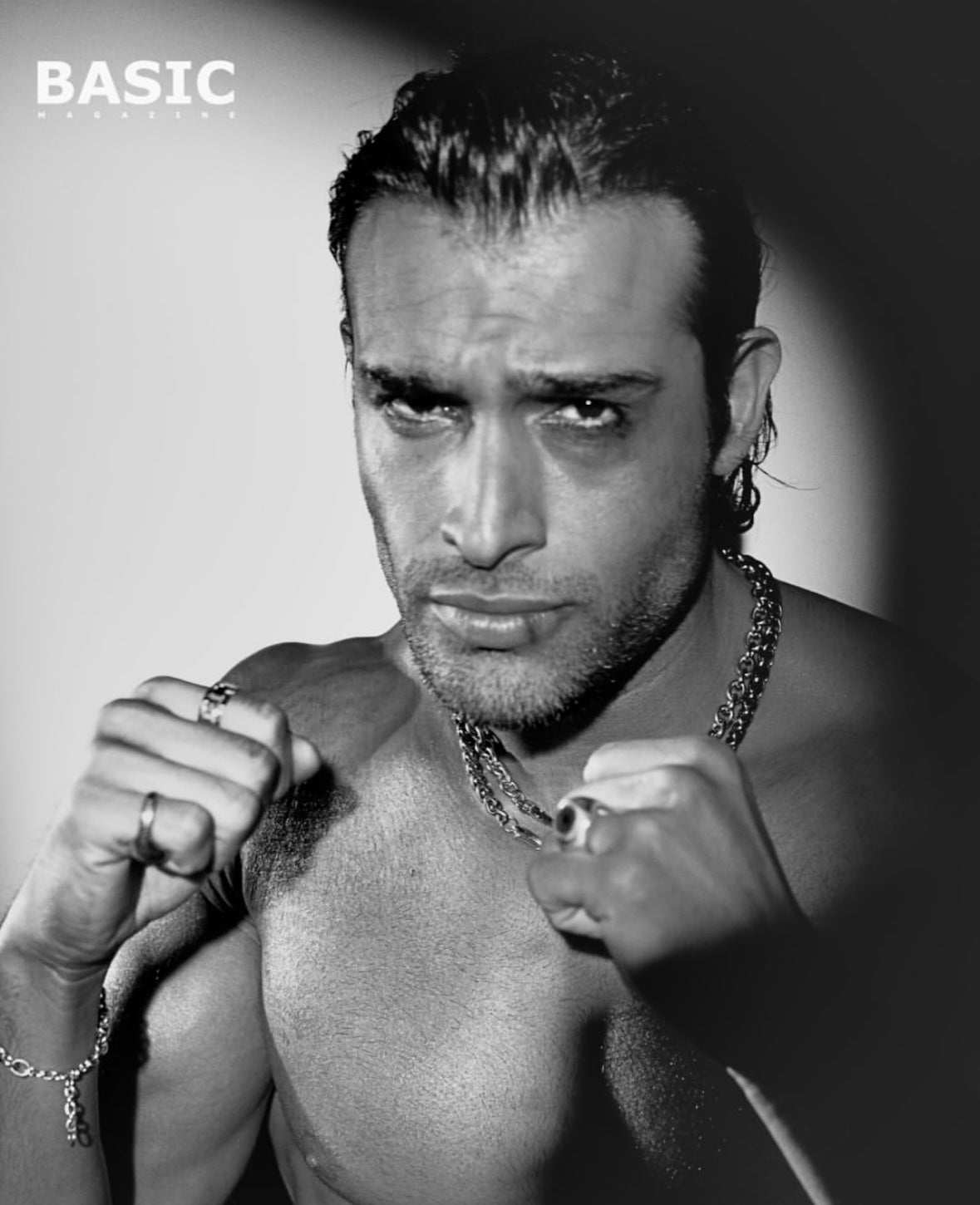 Actor Sam Asghari rockin' chain necklaces, bracelets, and rings for Basic Magazine.